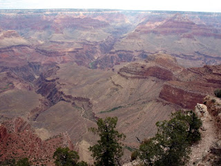 The views are, well, like I expected of the Grand Canyon, and I expected a lot. You really can see forever here... and forever is *chock full* to the horizon with twists, turns, peaks piled on peaks, collapsed towers, flashes of green from hidden springs and space... ohhhh so much space! The sense of distance is palpable - its so damn BIG. We join the elite 5% club - those who venture beneath the rim. We hick switchback after switchback down the South Kaibab Pass (the Northern end is at the North Rim - 28 miles and 3 days hike away - thats why we didn't take the hike there!) After an hour of steep descent we reach "ooh-aaah point" and boy did we ooh-and-aaah! Its BIG down here, thousands of feet below us we can still see the path winding down, thousands of feet below that we can see the Colorado, green and slow and welcoming from this altitude (but a raging torrent down there with 3 of the worlds top ten rapids in its winding trail). Eagles swoop by - some two thousand feet below, hunting prey on the slopes. People just stop and stare, quietly taking it all in, only stopping to ask again and again for poor Lib to take their photo please... Its only after we get back and see our path winding down the side of the canyon from another viewpoint that we realise just how little we've scratched the surface of this place... what we thought was a mighty descent into the maw of the canyon was a minor toe-dipping excersice down the mile deep behemoth...